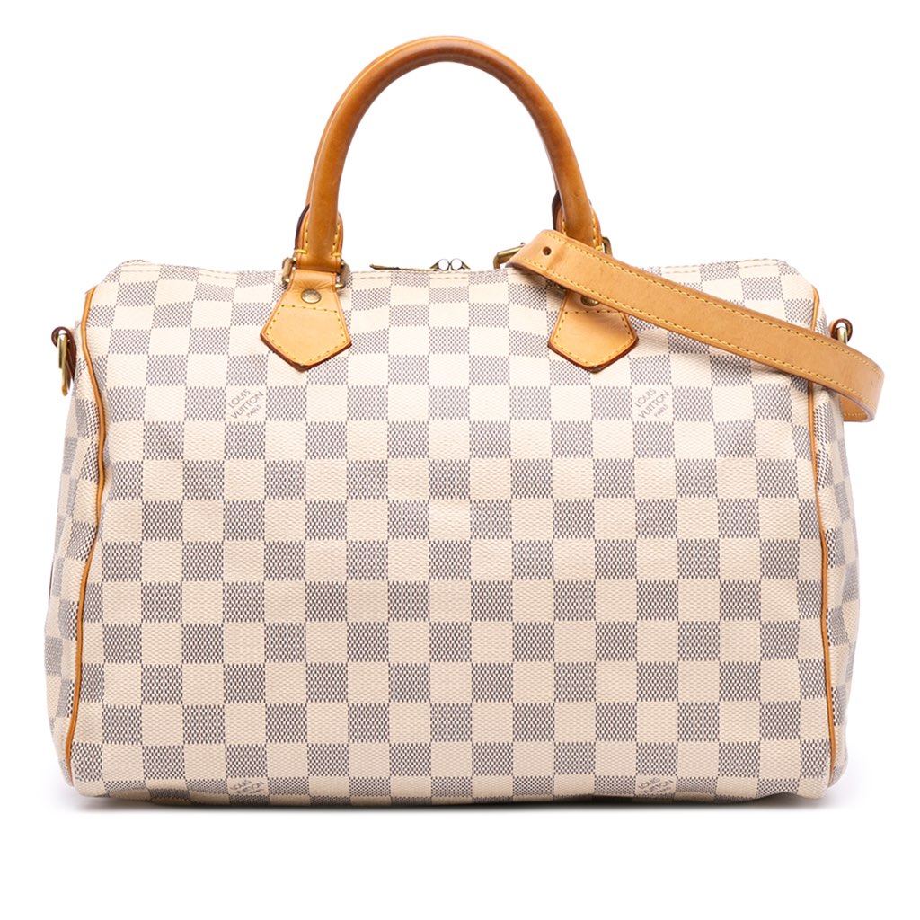 The Speedy Bandouliere 30 features a damier azur canvas body with vachetta leather trim, rolled vachetta leather handles, detachable flat vachetta leather strap, a top zip closure, and an interior zip pocket.