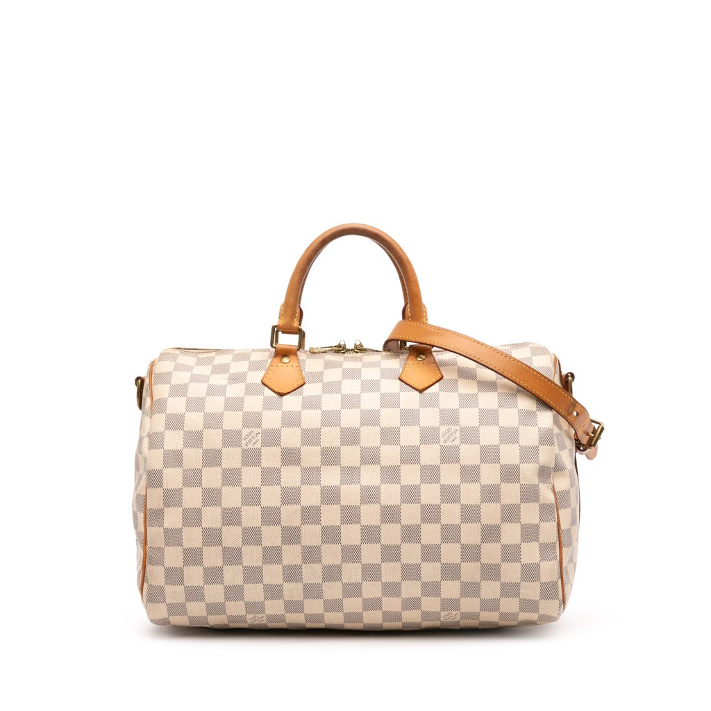 The Speedy 35 features a damier azur canvas body with vachetta leather trim, rolled vachetta leather handles, detachable flat vachetta leather shoulder strap, a top zip closure, and an interior pocket.