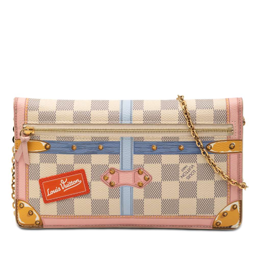 The Summer Trunks Pochette Weekend features a printed damier azur canvas body, a gold-tone curb chain link strap, a flap with snap button closure, an exterior front zip pocket, and interior zip pockets and card slots.