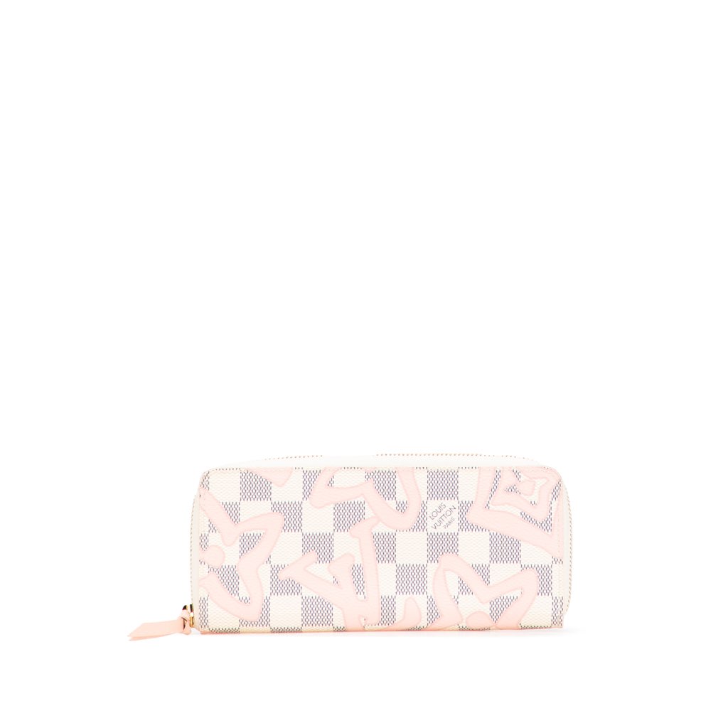This wallet features a damier azur canvas body, a zip-around closure, and interior zip and slip pockets.
