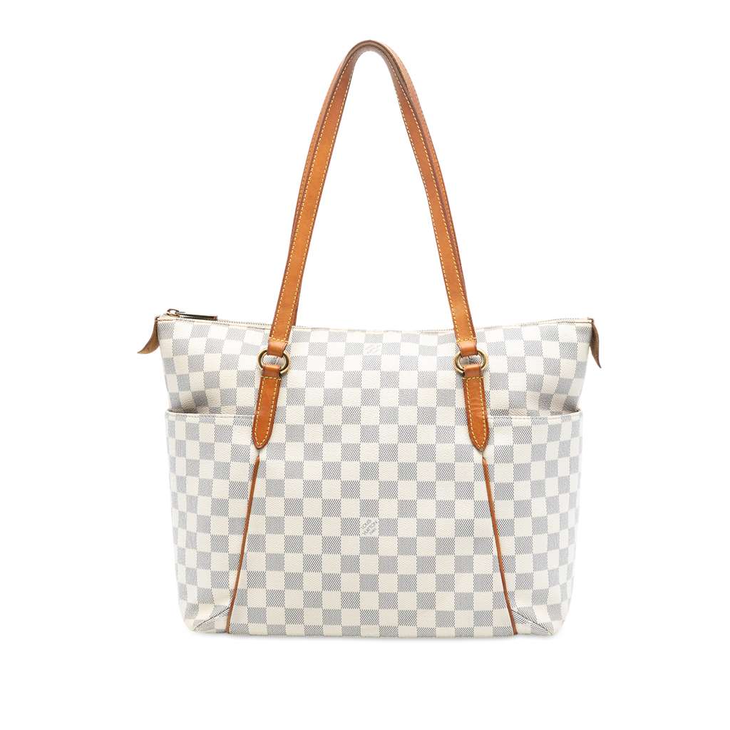 The Totally MM features a damier azur canvas body with vachetta leather trim, flat vachetta leather straps, a top zip closure, exterior side open pockets, and an interior slip pocket.