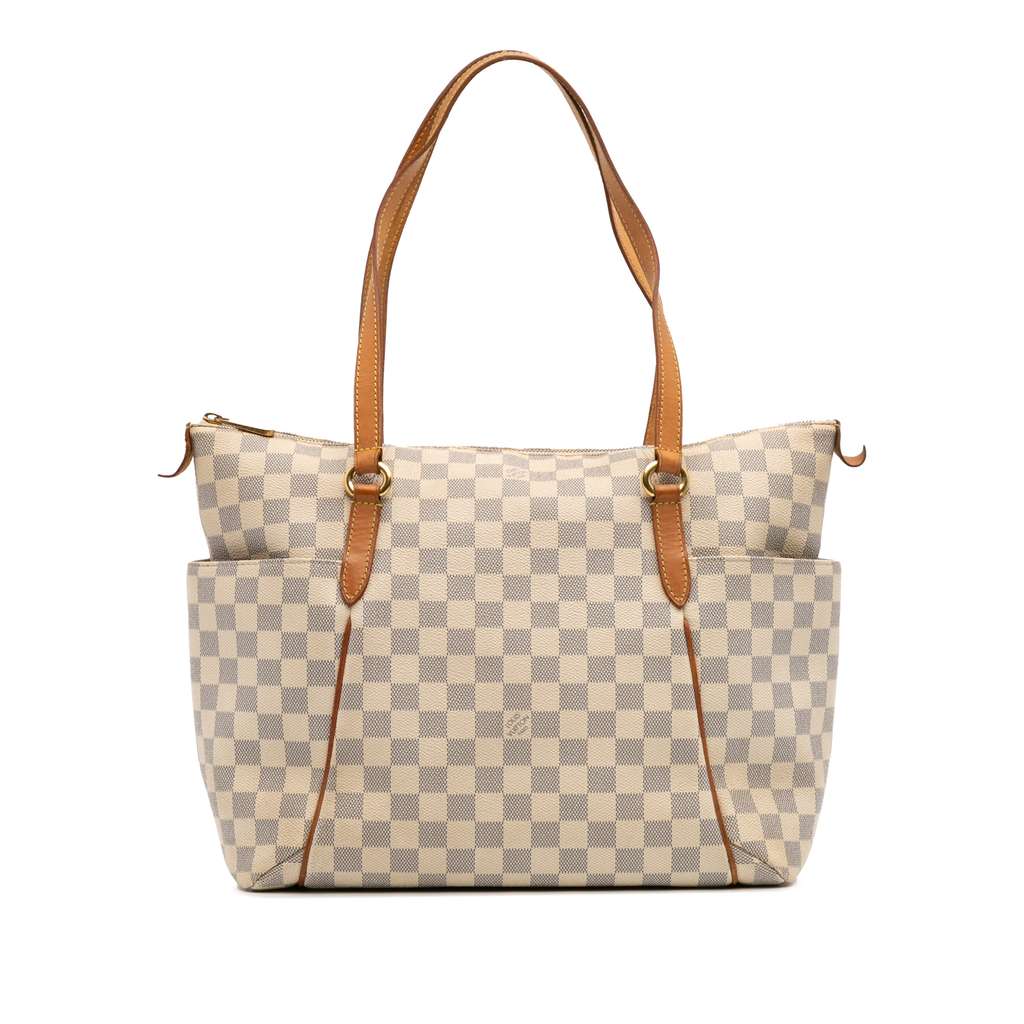 The Totally MM features a damier azur canvas body with vachetta leather trim, flat vachetta leather straps, a top zip closure, exterior side open pockets, and an interior slip pocket.