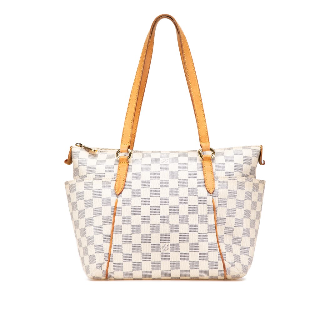 The Totally PM features a damier azur canvas body with vachetta leather trim, flat vachetta leather handles, a top zip closure, exterior side slip pockets, and interior slip pockets.