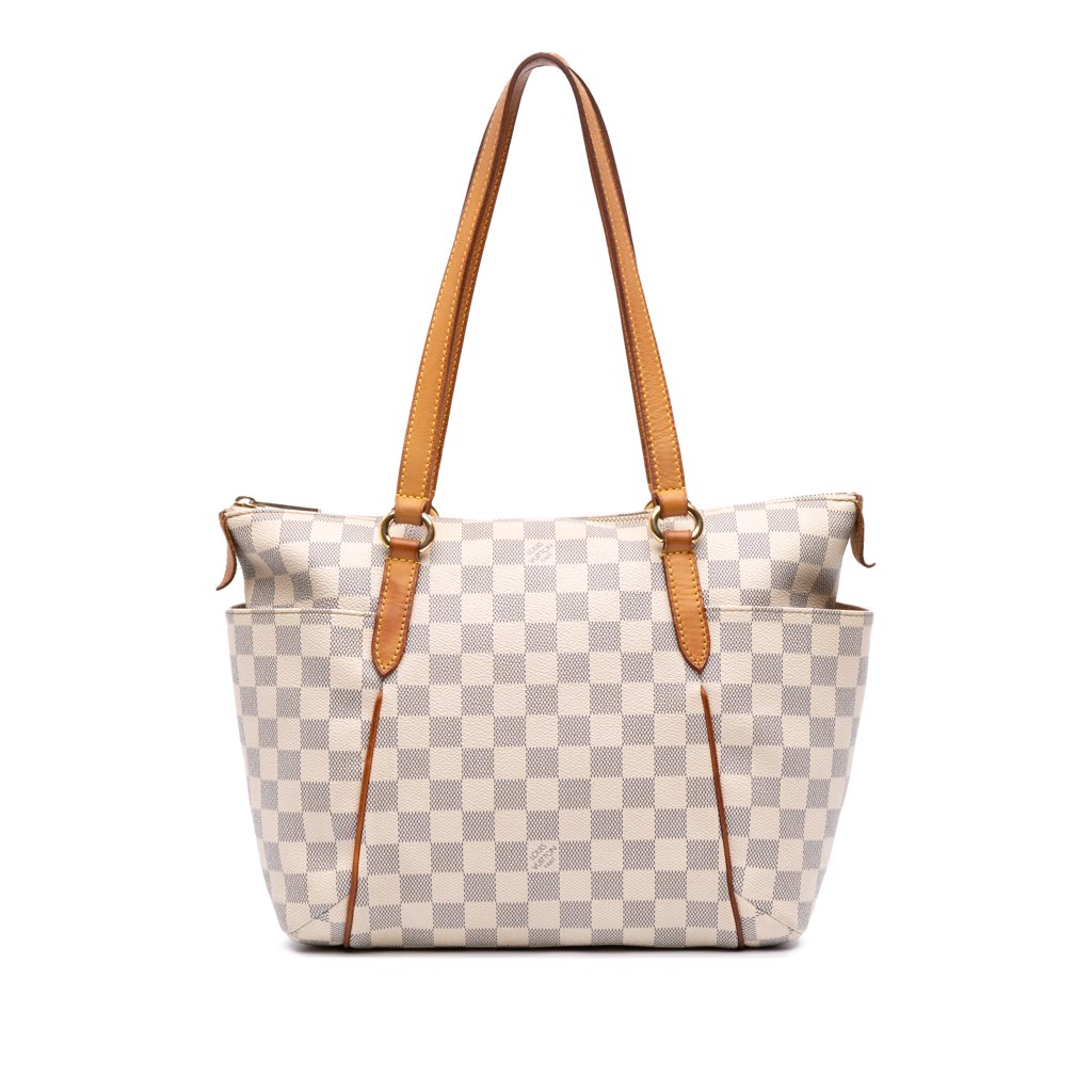 The Totally PM features a damier azur canvas body with vachetta leather trim, flat vachetta leather straps, a top zip closure, exterior side slip pockets, and interior slip pockets.
