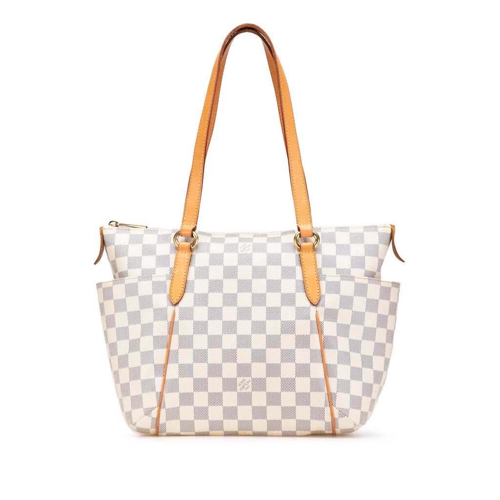 The Totally PM features a damier azur canvas body with vachetta leather trim, flat vachetta leather straps, a top zip closure, exterior side slip pockets, and interior slip pockets.