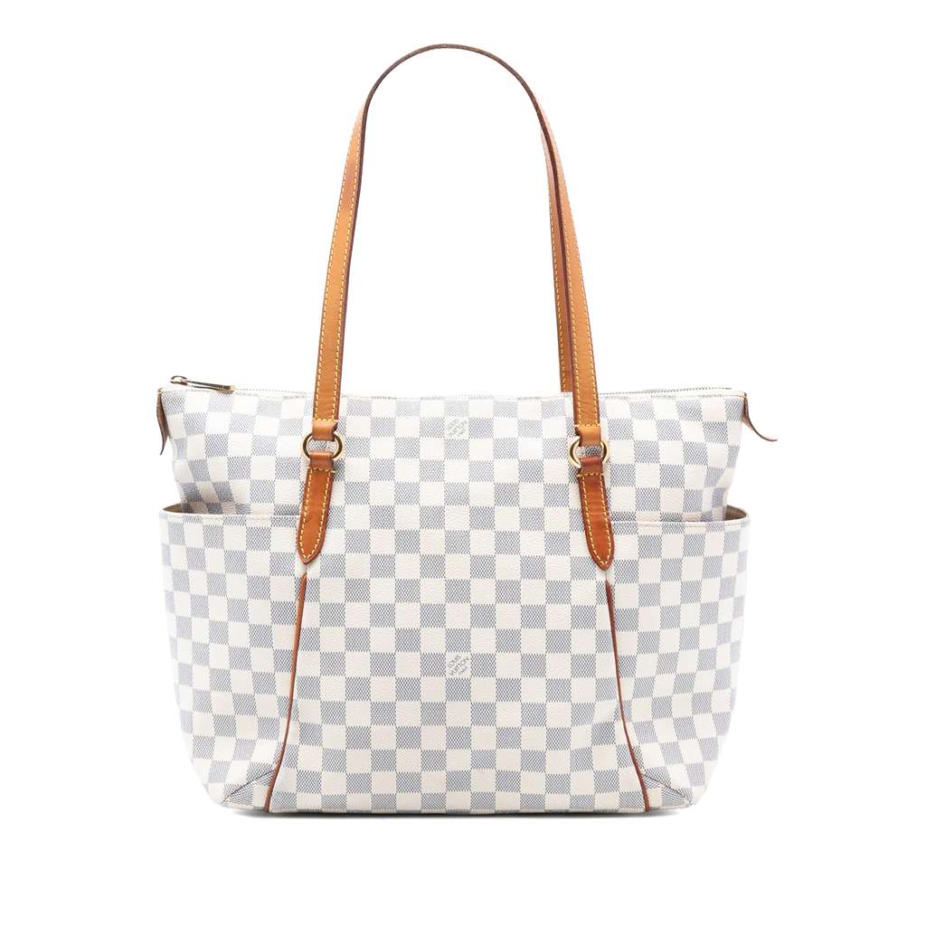 The Totally PM features a damier azur canvas body with vachetta leather trim, flat vachetta leather handles, a top zip closure, exterior side slip pockets, and an interior slip pocket.