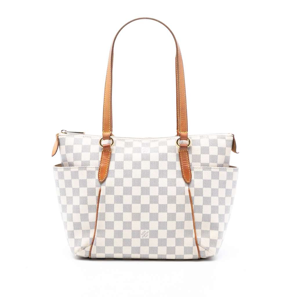The Totally PM features a damier azur canvas body with vachetta leather trim, flat vachetta leather handles, a top zip closure, exterior side slip pockets, and an interior slip pocket.