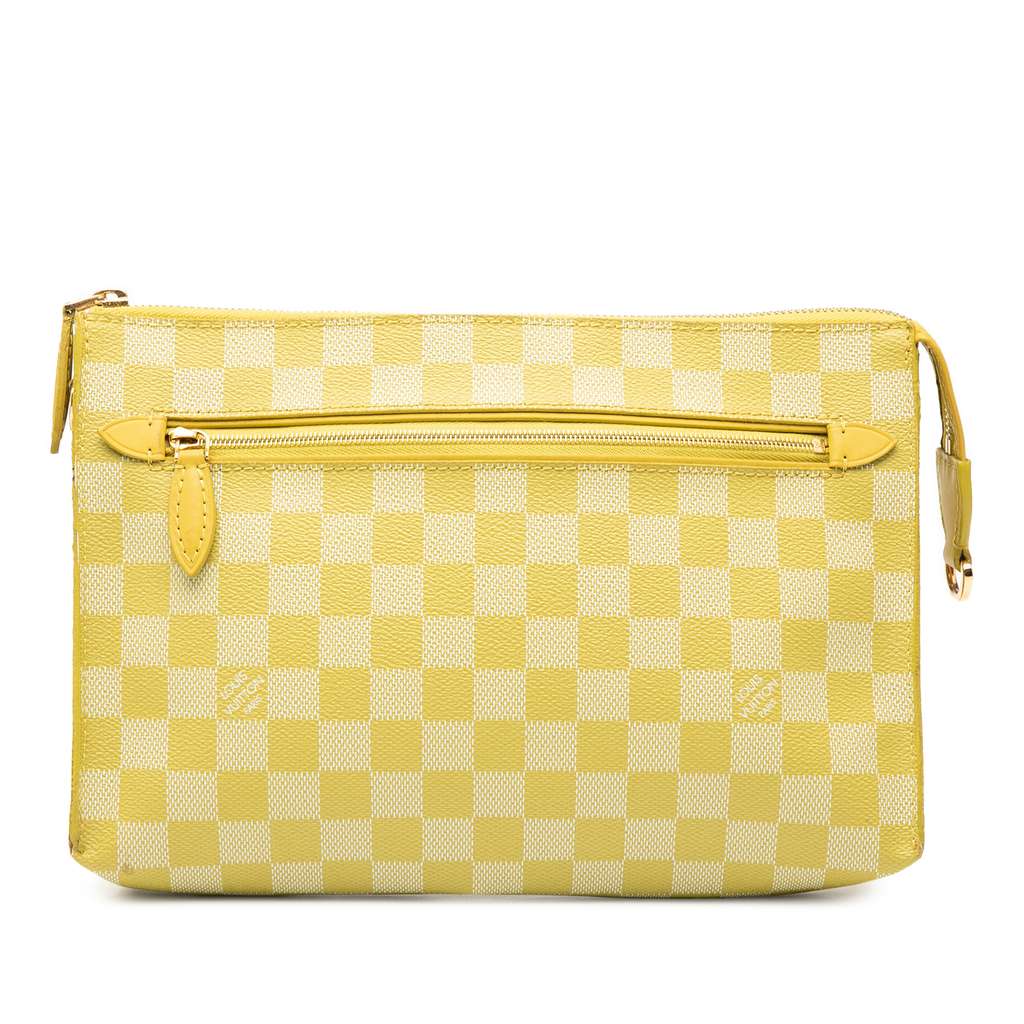 The Element Clutch features a damier couleurs canvas body with leather trim, a top zip closure, an exterior zip pocket, and interior slip pockets.