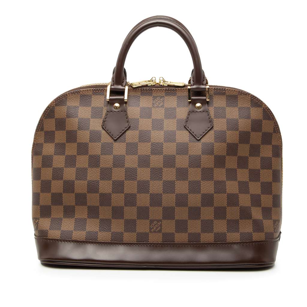 The Alma PM features a damier ebene canvas body with leather trim, rolled leather handles, a top zip closure, and interior slip pockets.