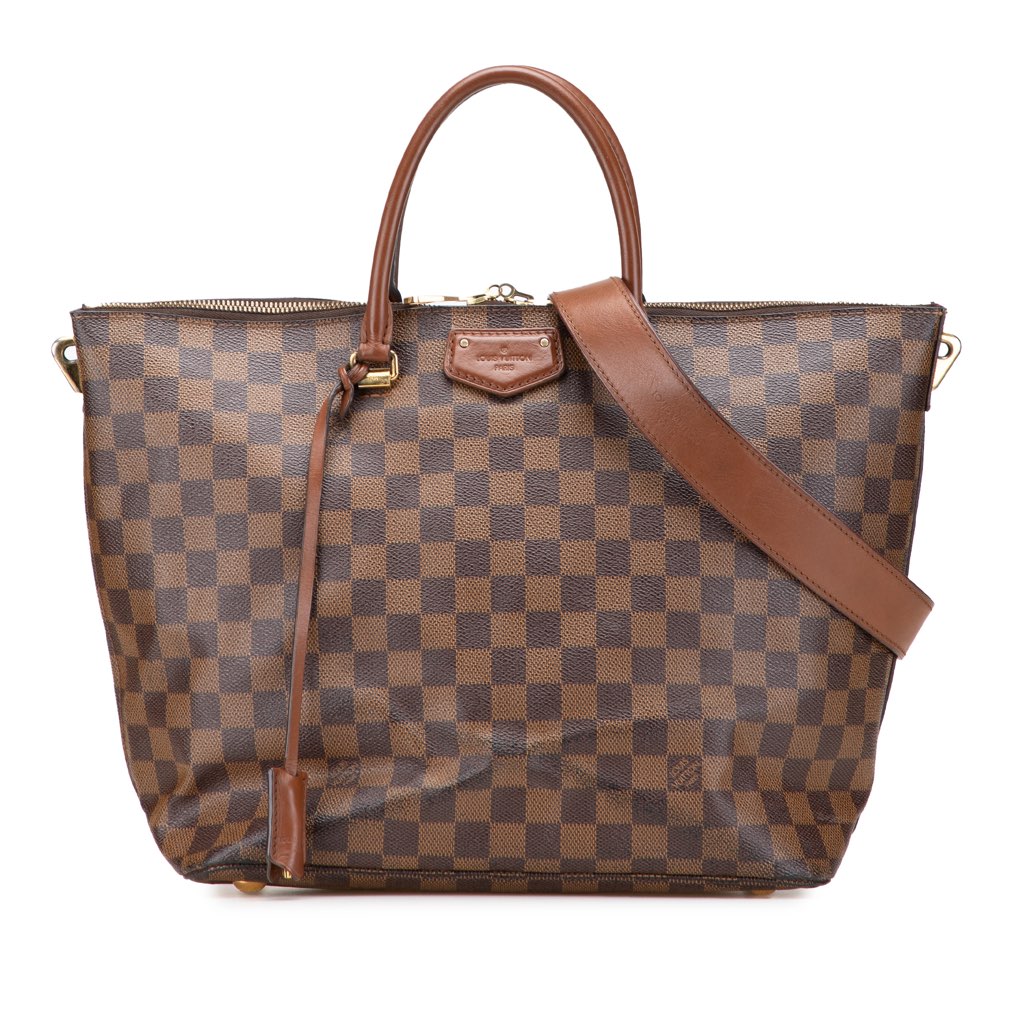 The Belmont MM features a damier ebene canvas body, rolled leather handles, a detachable flat leather strap, a top zip closure, and interior slip pockets.
