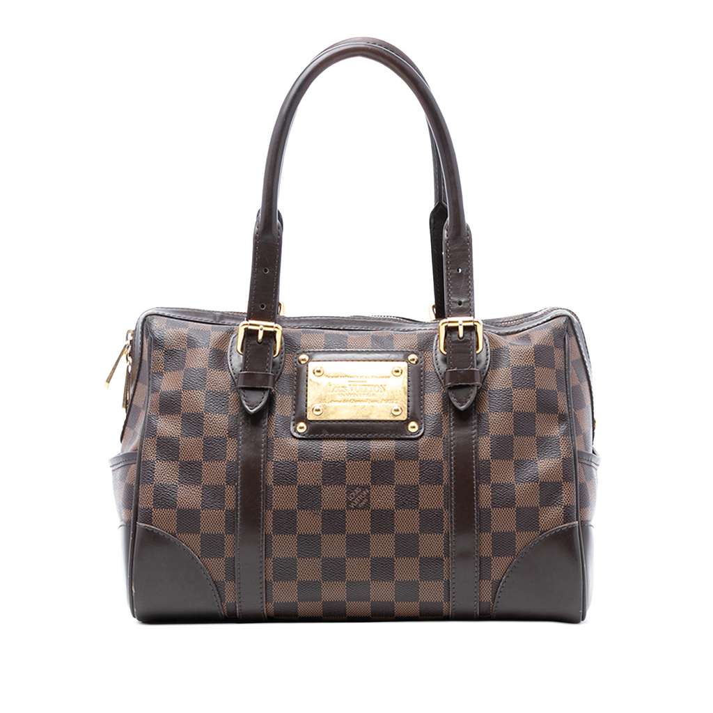 The Berkeley features a damier ebene canvas body with leather trim, rolled leather handles, a top zip closure, exterior side slip pockets, and interior slip pockets.
