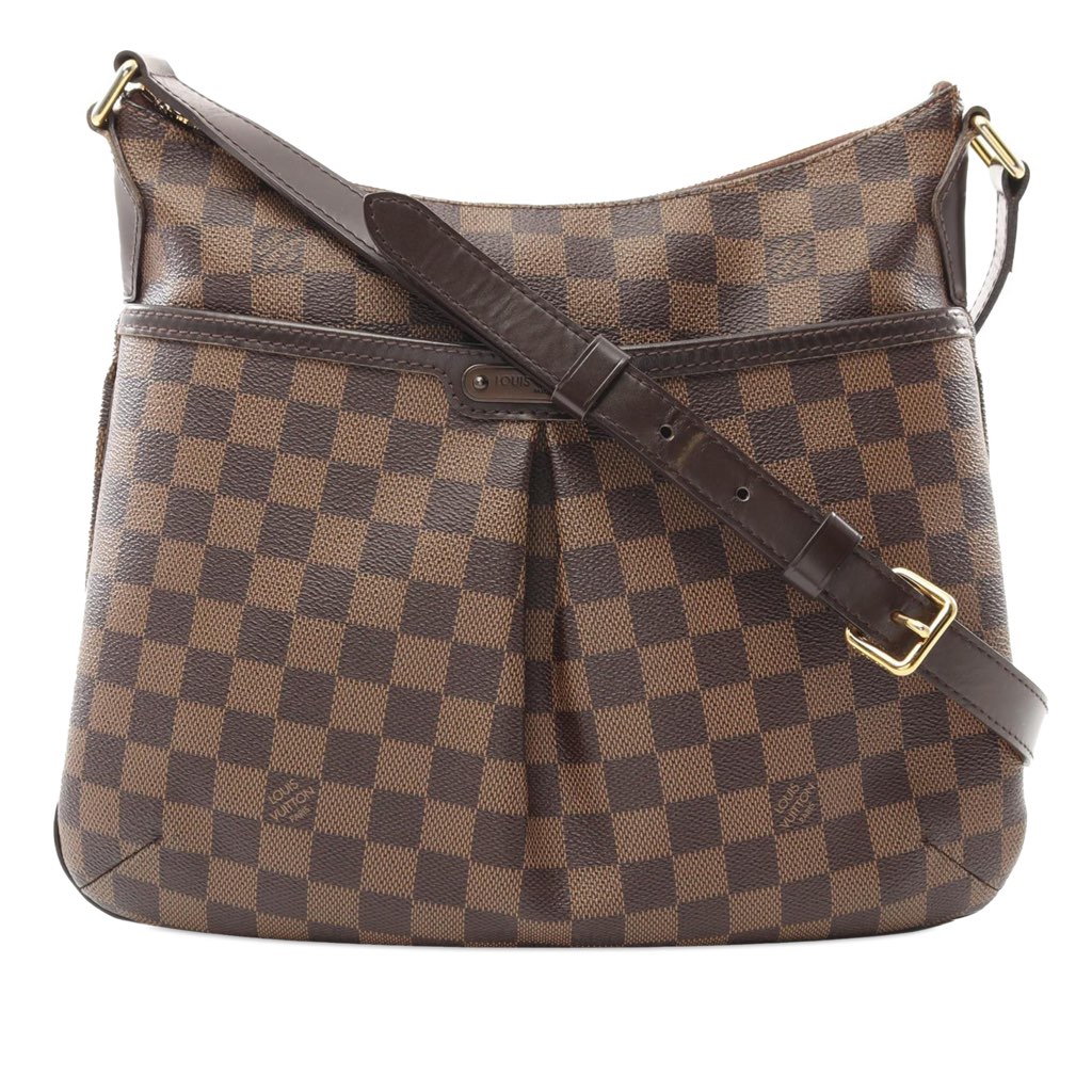 The Bloomsbury features a damier ebene canvas body with leather trim, a flat leather strap, a top zip closure, exterior front open pockets, and interior slip pockets.