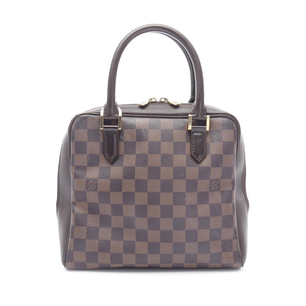 The Brera features a damier ebene canvas body with leather trim, rolled leather handles, a top zip closure, and an interior zip pocket.
