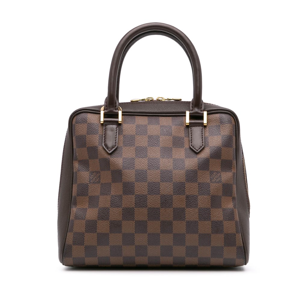 The Brera features a damier ebene canvas body with leather trim, rolled leather handles, a top zip closure, and an interior zip pocket.