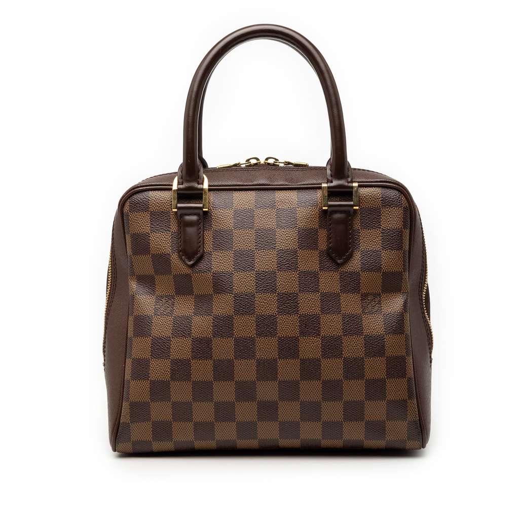 The Brera features a damier ebene canvas body with leather trim, rolled leather handles, a top zip closure, and an interior zip pocket.
