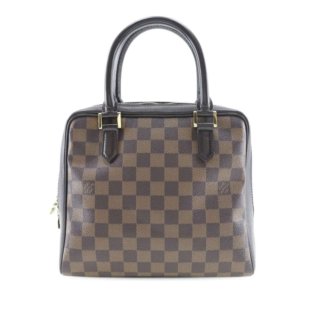 The Brera features a damier ebene canvas body with leather trim, rolled leather handles, a top zip closure, and an interior zip pocket.