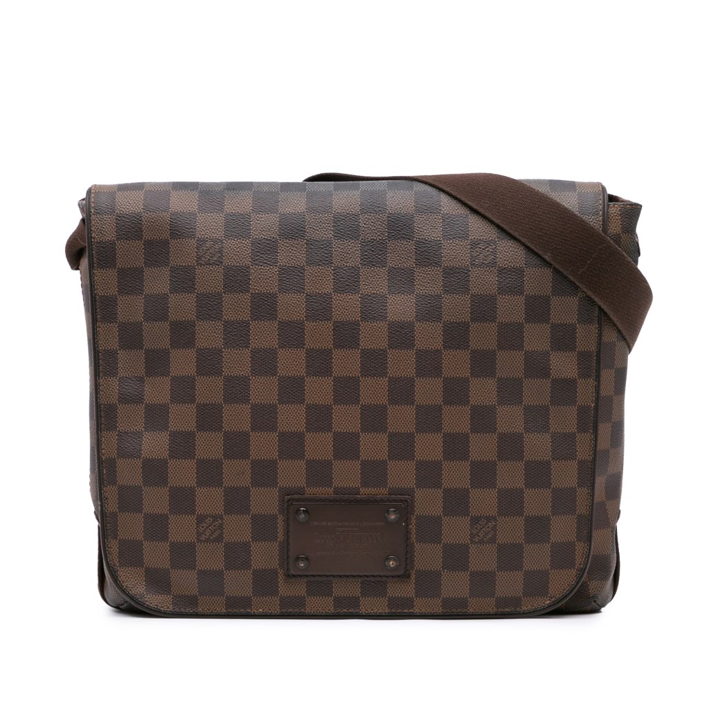 The Brooklyn MM features a damier ebene canvas body, an adjustable flat strap, a front flap with magnetic closure, an exterior back zip pocket, and interior slip pockets.
