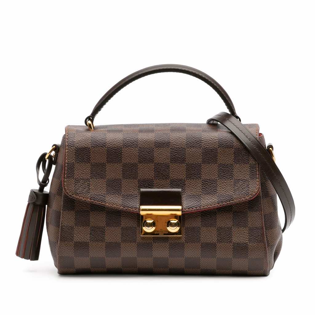 The Croisette features a damier canvas body with leather trim, a top rolled leather handle, a detachable flat leather strap, a leather tassel detail, a front flap with a gold-tone push lock closure, and an interior slip pocket.
