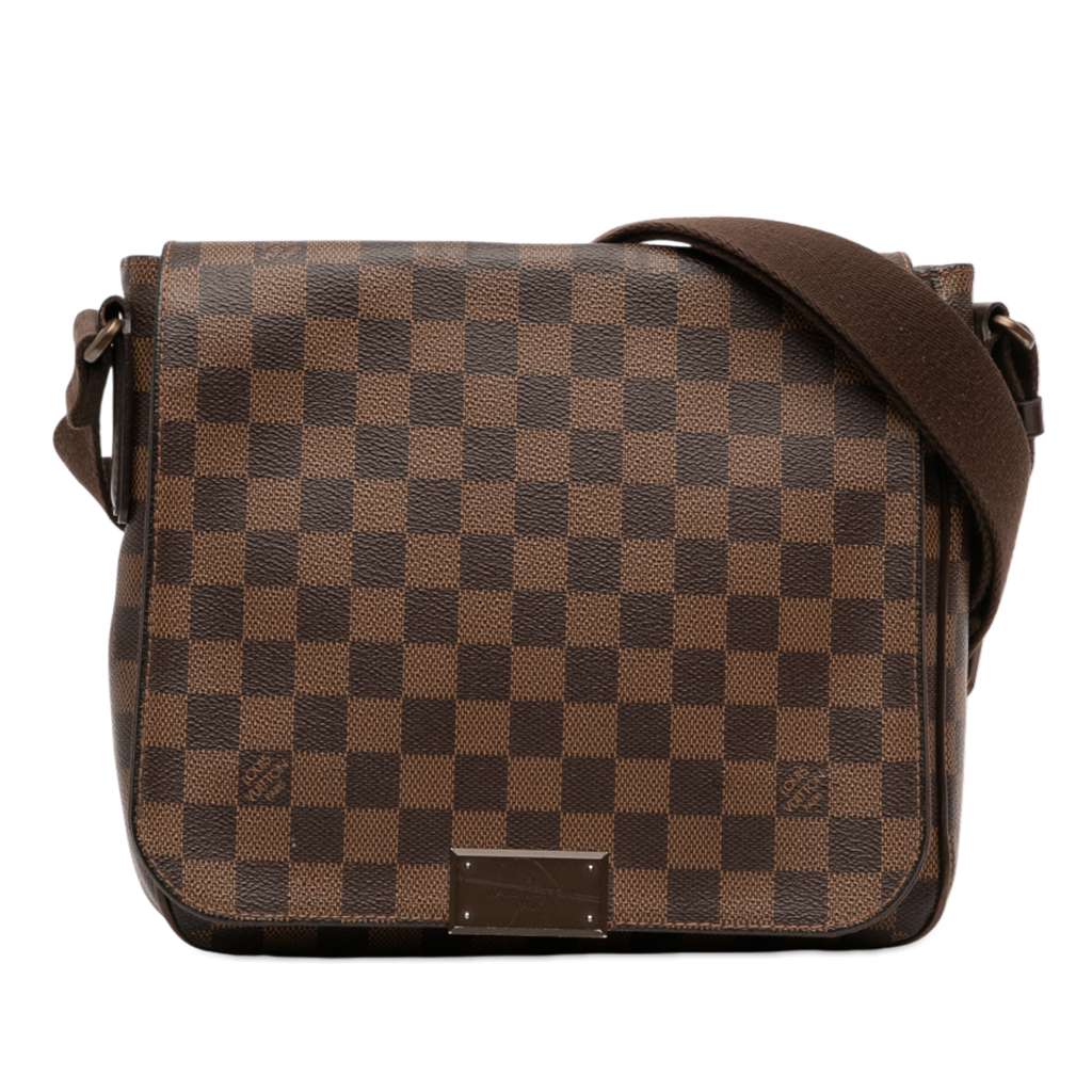 The District PM features a damier canvas body, an adjustable flat shoulder strap, a front flap with magnetic closure, an exterior front slip pocket, and interior slip pockets.