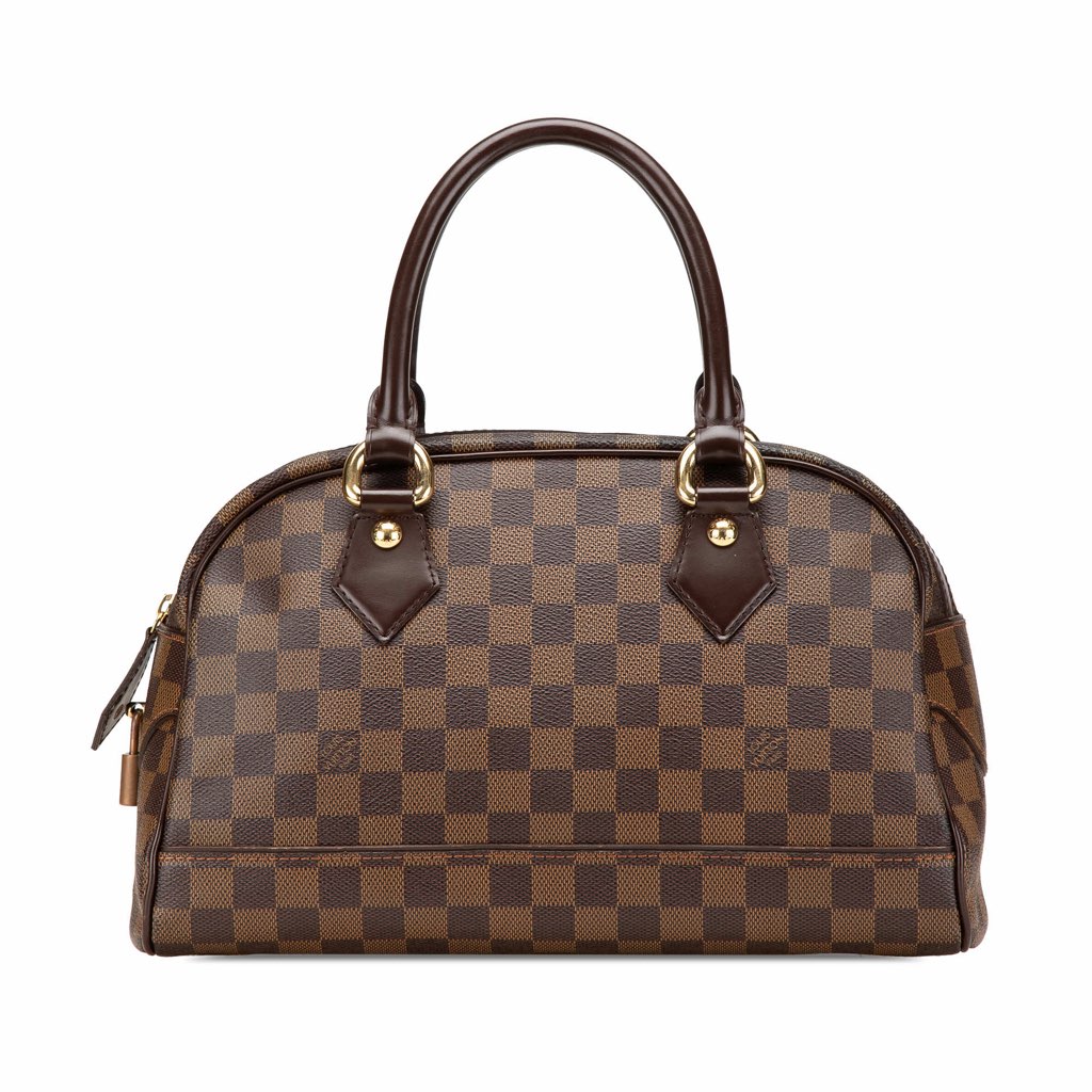 The Duomo features a damier ebene canvas body with leather trim, rolled leather handles, a top zip closure, and an interior slip pocket.