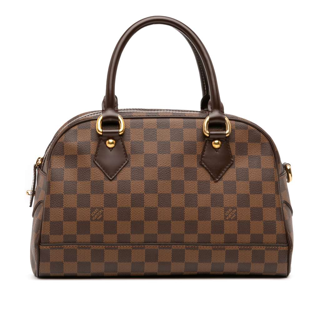 The Duomo features a damier ebene canvas body with leather trim, a clochette, rolled leather top handles, a top zip closure, and interior slip pockets.
