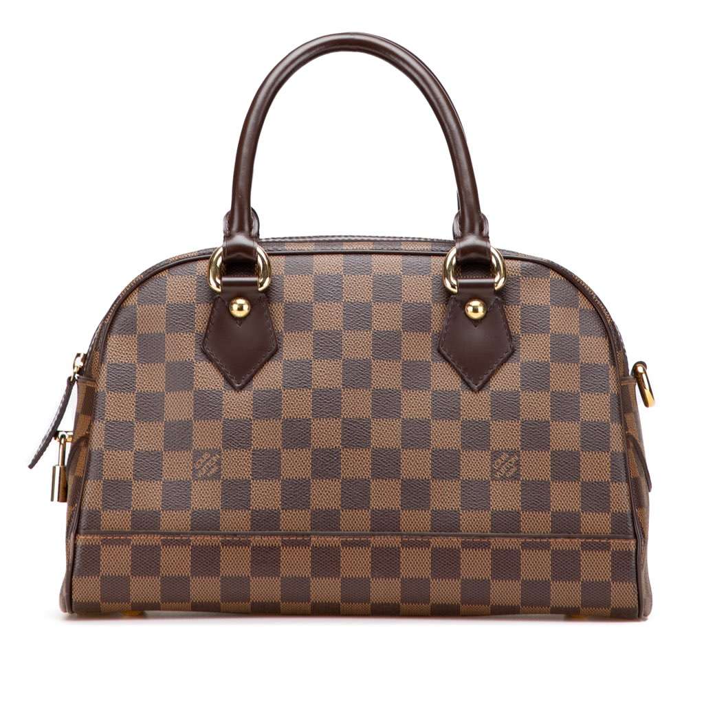 The Duomo features a damier ebene canvas body with leather trim, rolled leather handles, a top zip closure, and interior slip pockets.