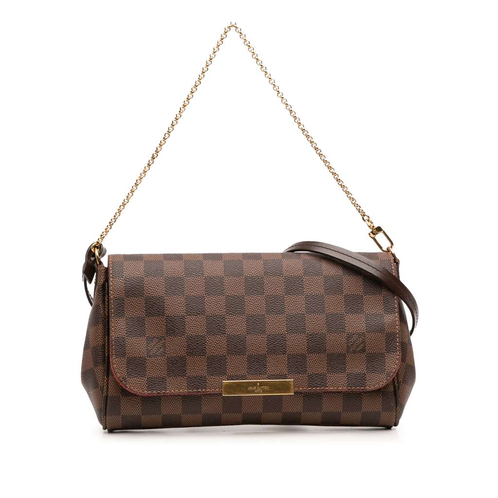 The Favorite MM features a damier ebene canvas body, a chain link strap, a detachable flat leather strap, a front flap with magnetic snap closure, and an interior slip pocket.