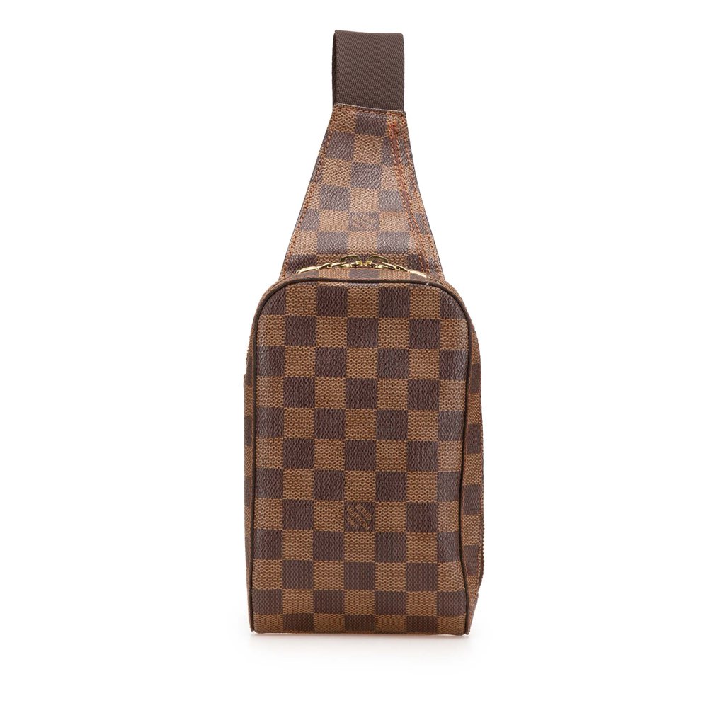 The Geronimos features a damier ebene canvas body, an adjustable flat strap, and a top zip closure.