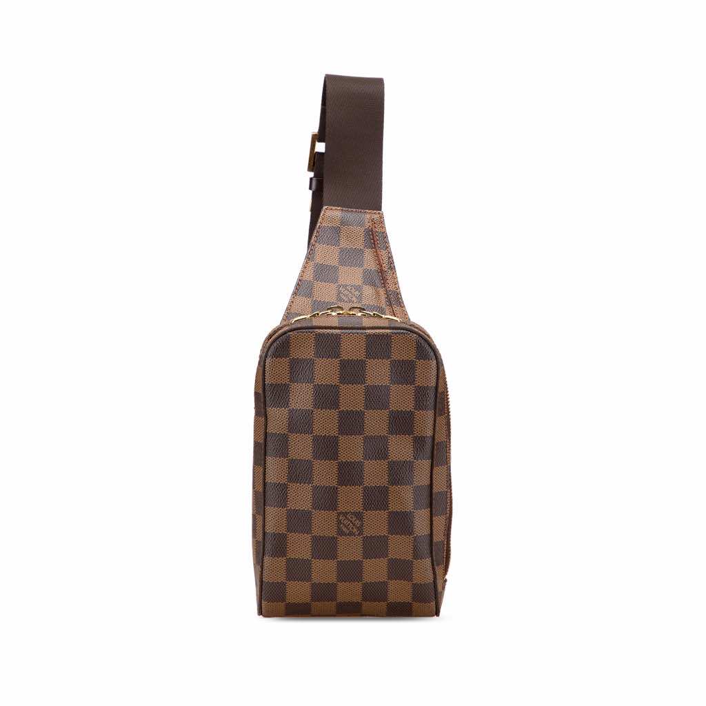 The Geronimos features a damier ebene canvas body, an adjustable flat canvas strap, a top zip closure, and an exterior front slip pocket.