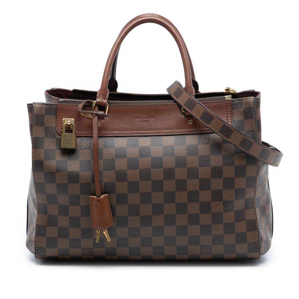 The Greenwich features a damier canvas body with leather trim, rolled leather handles, a detachable flat strap, a top zip closure, and interior zip and slip pockets. Handles have been repainted.