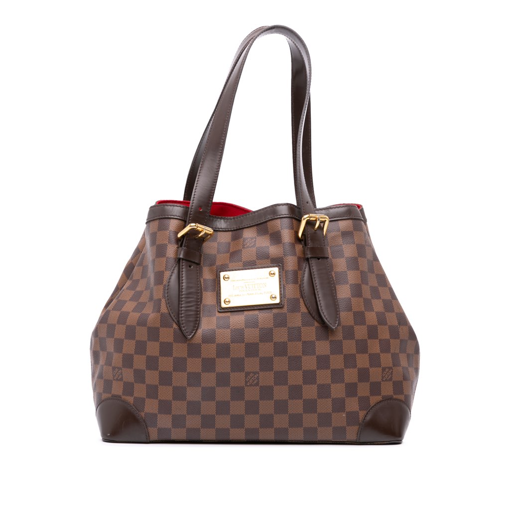The Hampstead GM features a damier canvas body with leather trim, flat leather shoulder straps, an open top with lobster clasp closure, and interior zip and slip pockets.