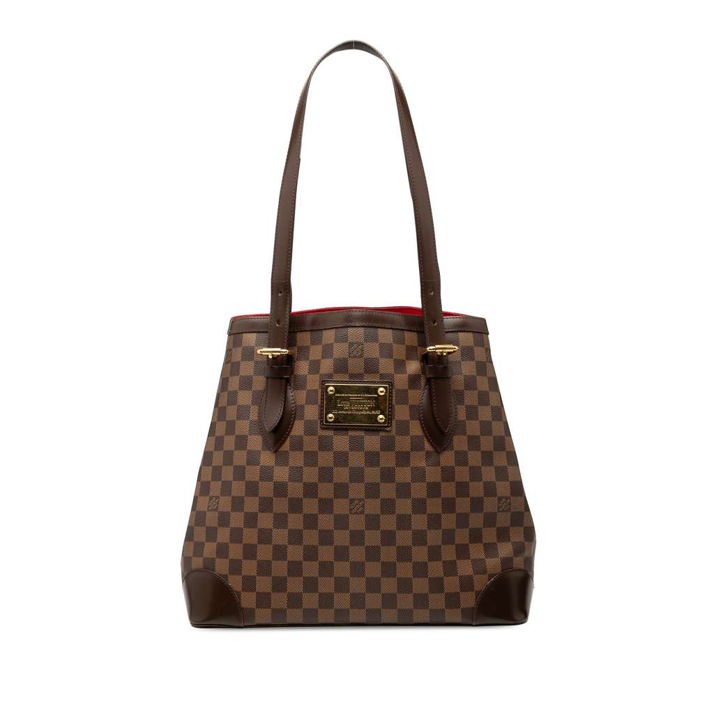 The Hampstead GM features a damier canvas body with leather trim, adjustable flat leather shoulder straps, an open top with hook closure, and interior zip and slip pockets.