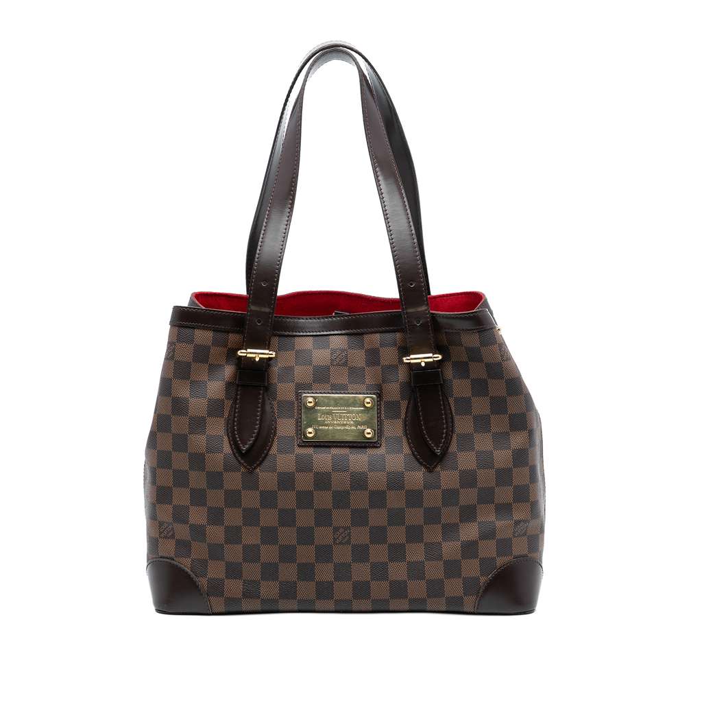 The Hampstead MM features a damier ebene canvas body with leather trim, adjustable flat leather handles, an open top with s snap closure, and an interior zip and slip pockets.