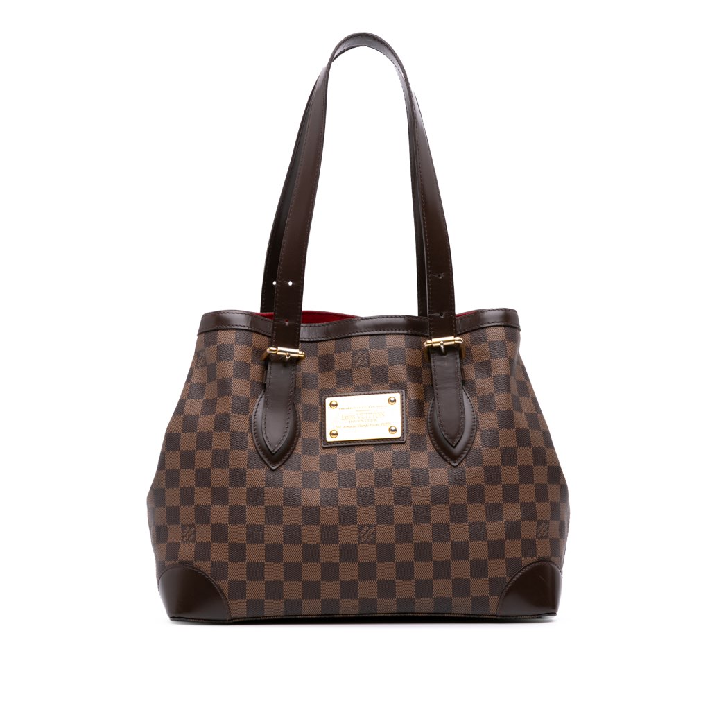 The Hampstead MM features a damier ebene canvas body with leather trim, adjustable flat leather handles, an open top with hook closure, and interior zip and slip pockets.