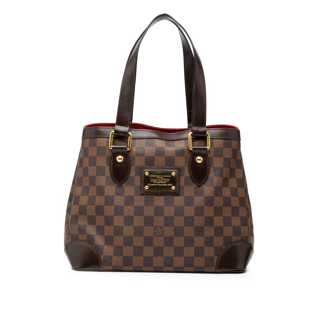 The Hampstead PM features a damier ebene canvas body with leather trim, flat leather handles, an open top, and interior zip and slip pockets.