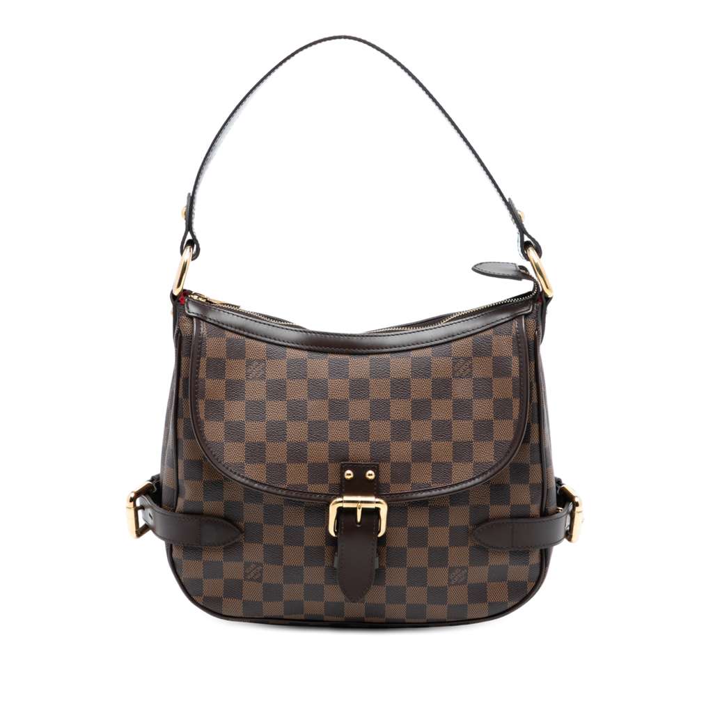 The Highbury features a damier ebene canvas body with leather trim, a flat leather strap, a top zip closure, an exterior front flap pocket, dual interior compartments, and interior slip pockets.