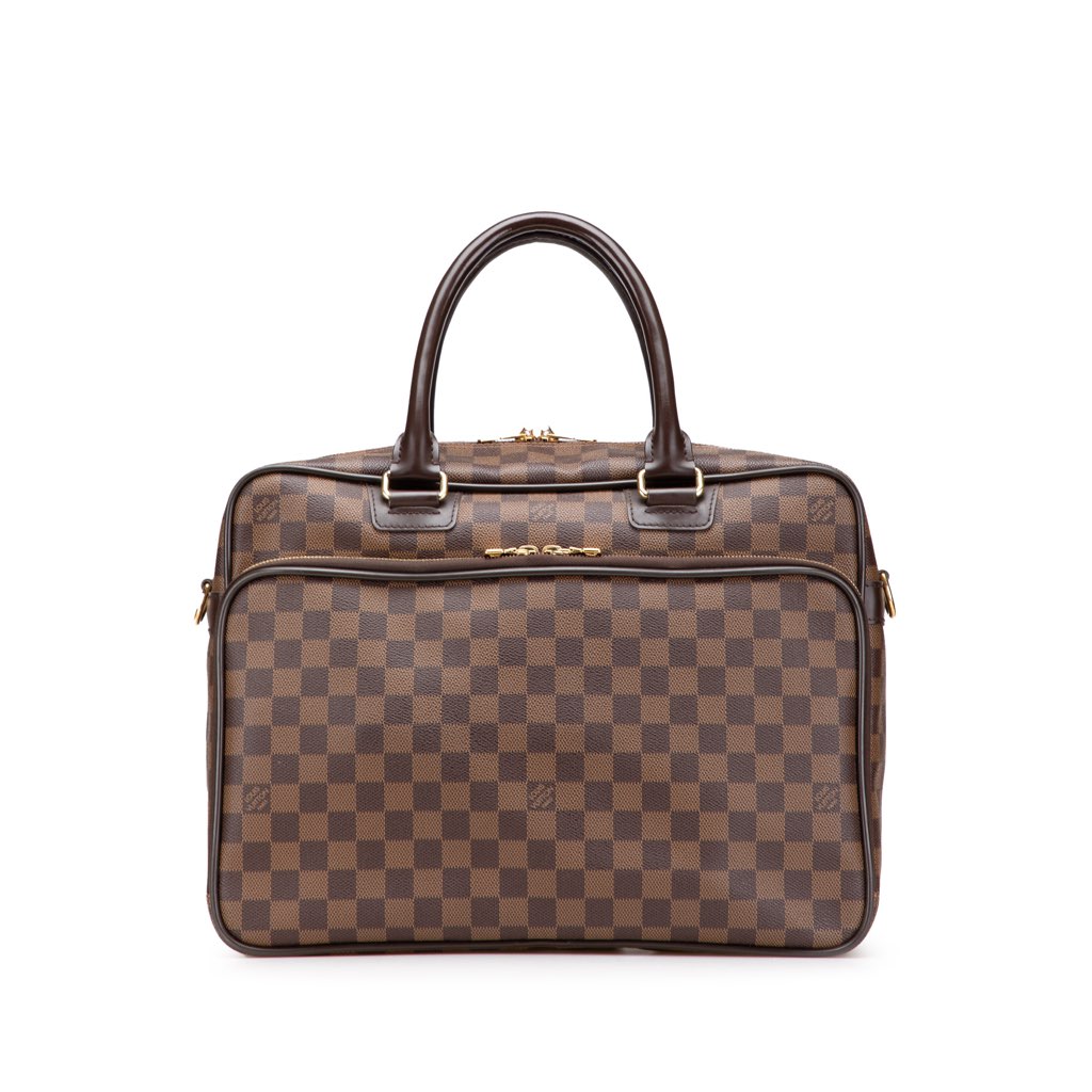 The Icare Laptop Bag features a damier canvas body, rolled leather handles, a top zip closure, a detachable flat shoulder strap, an exterior front zip compartment with interior slip pockets, and an interior laptop holster.