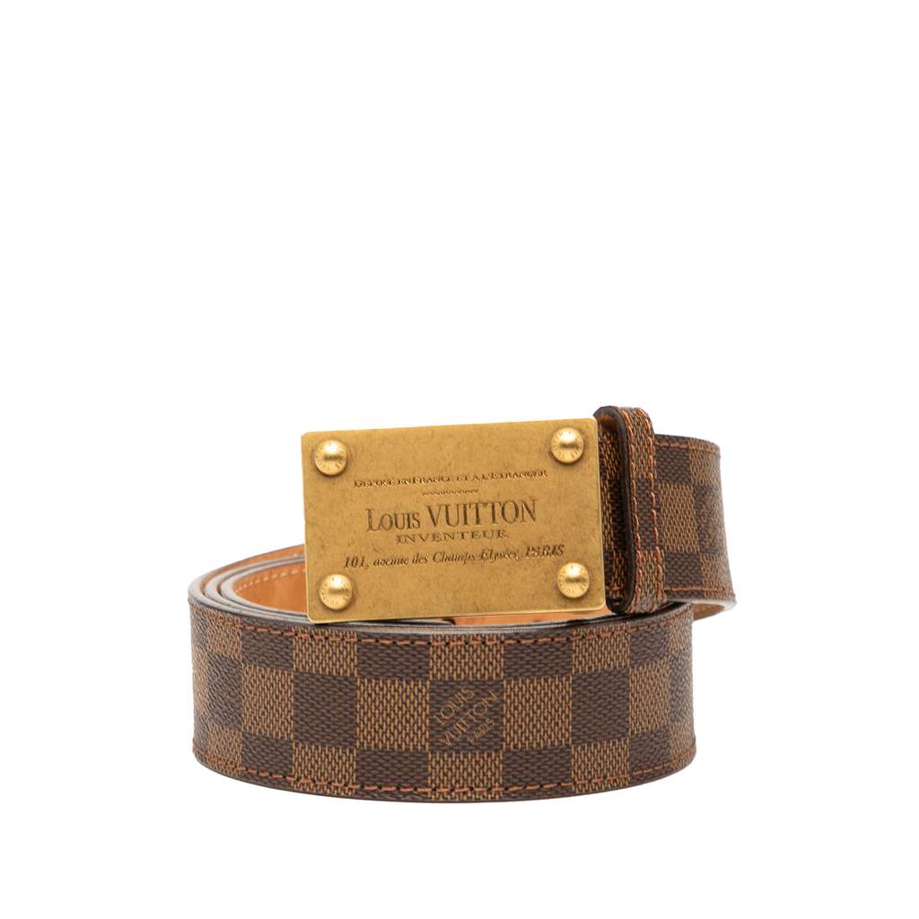 This belt features a damier ebene canvas body with gold tone buckle closure.