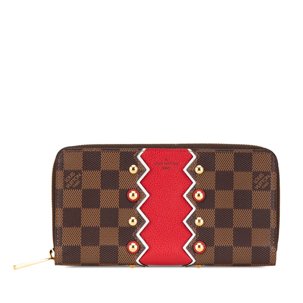 The Zippy wallet features damier ebene canvas body, a zip around closure, and interior zip and slip pockets.