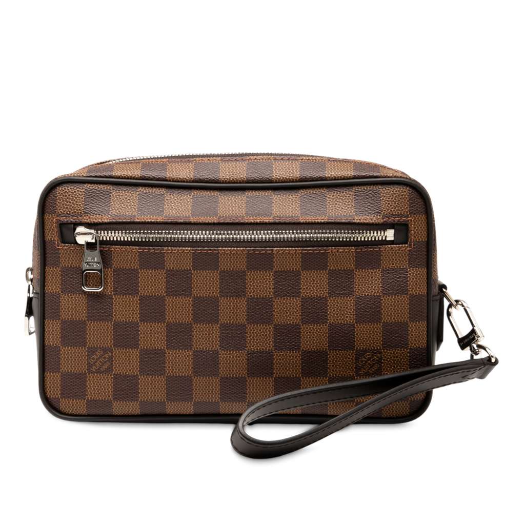 The Kasai features a damier canvas body with leather trim, a flat leather wrist strap, a top zip closure, an exterior zip pocket, and interior slip pocket and card slots.