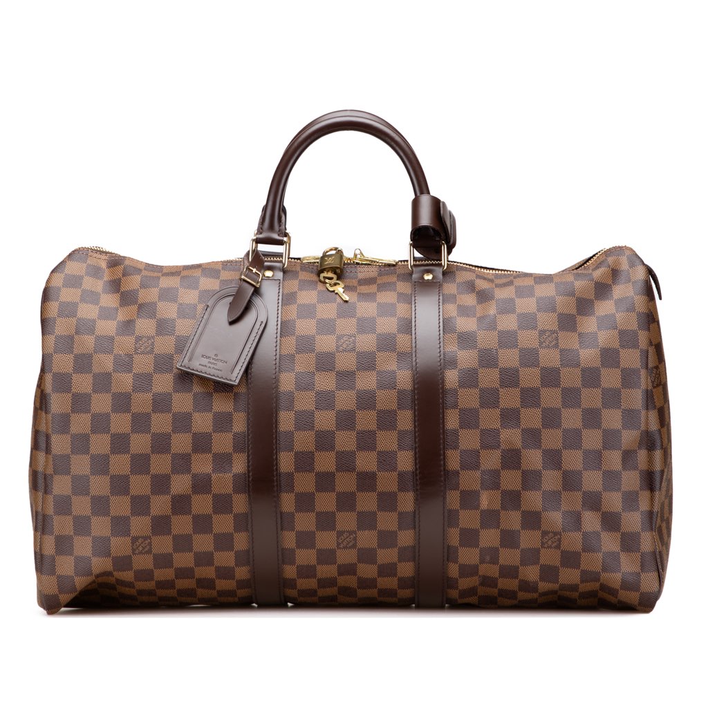 The Keepall 50 features a damier ebene body with leather trim, rolled leather handles, and a top zip closure.