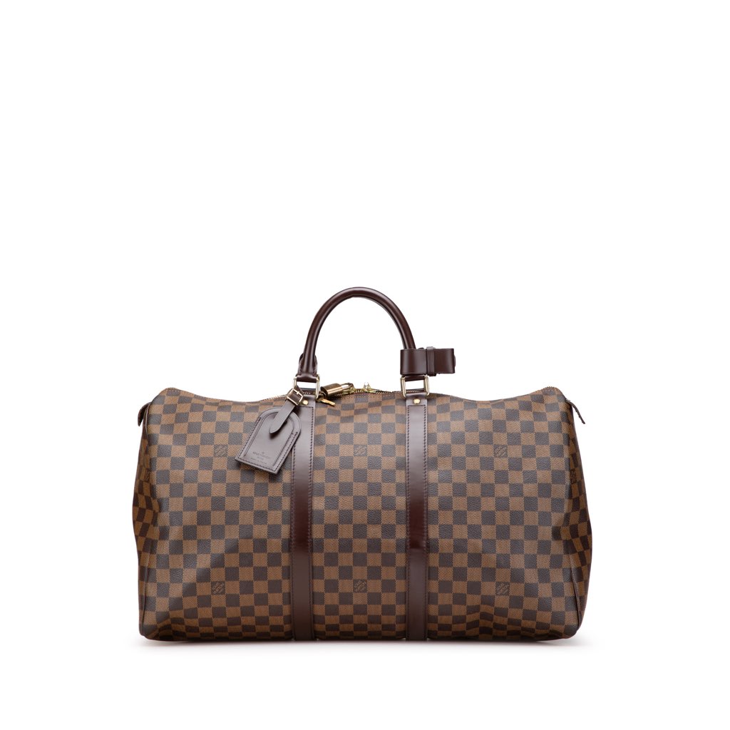 The Keepall 50 features a damier ebene canvas body with leather trim, rolled leather handles, and a top zip closure.