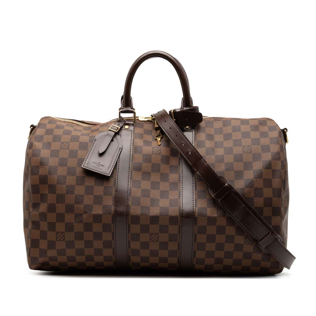 The Keepall Bandouliere 45 features a damier ebene canvas body with leather trim, rolled leather handles, a detachable flat leather strap, and a top zip closure.