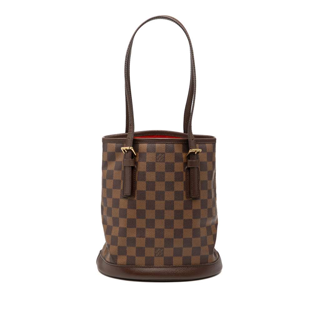 The Marais features a damier ebene canvas body with leather trim, adjustable flat leather shoulder straps, an open top, and interior zip pockets.