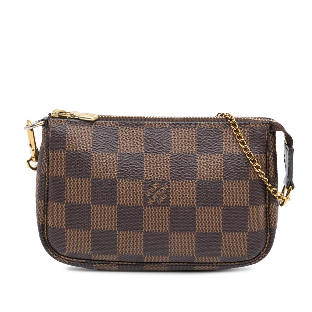 The Mini Pochette Accessoires features a damier ebene canvas body, a gold-tone chain link strap, and a top zip closure.