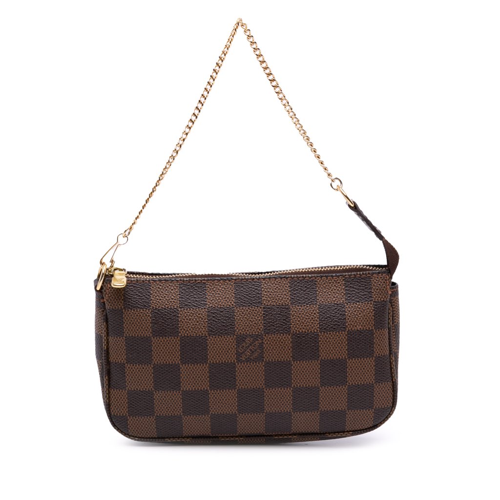 The Mini Pochette Accessoires features a damier canvas body, a gold-tone chain strap, and a top zip closure.