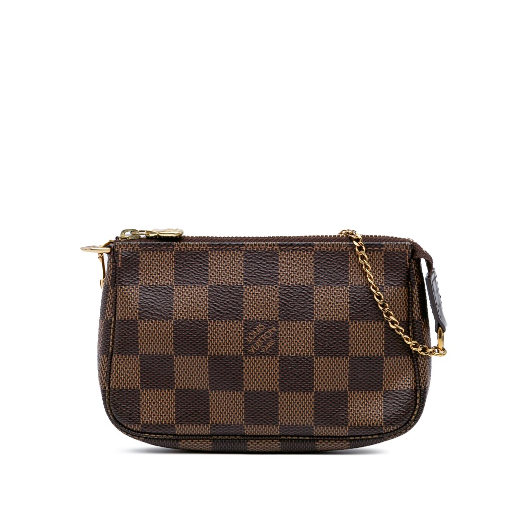 The Mini Pochette Accessoires features a damier canvas body, a gold-tone chain handle, and a top zip closure.