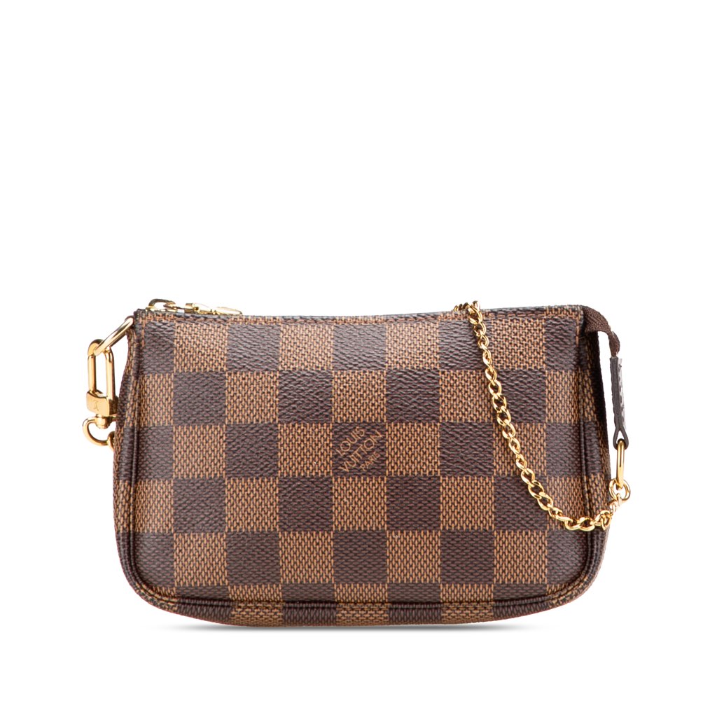 The Mini Pochette Accessoires features a damier canvas body, a chain link strap, and a top zip closure.
