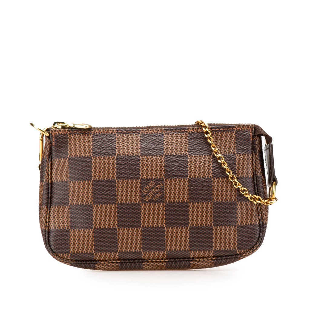 The Mini Pochette Accessoires features a damier ebene canvas body, a gold-tone chain link strap, and a top zip closure.