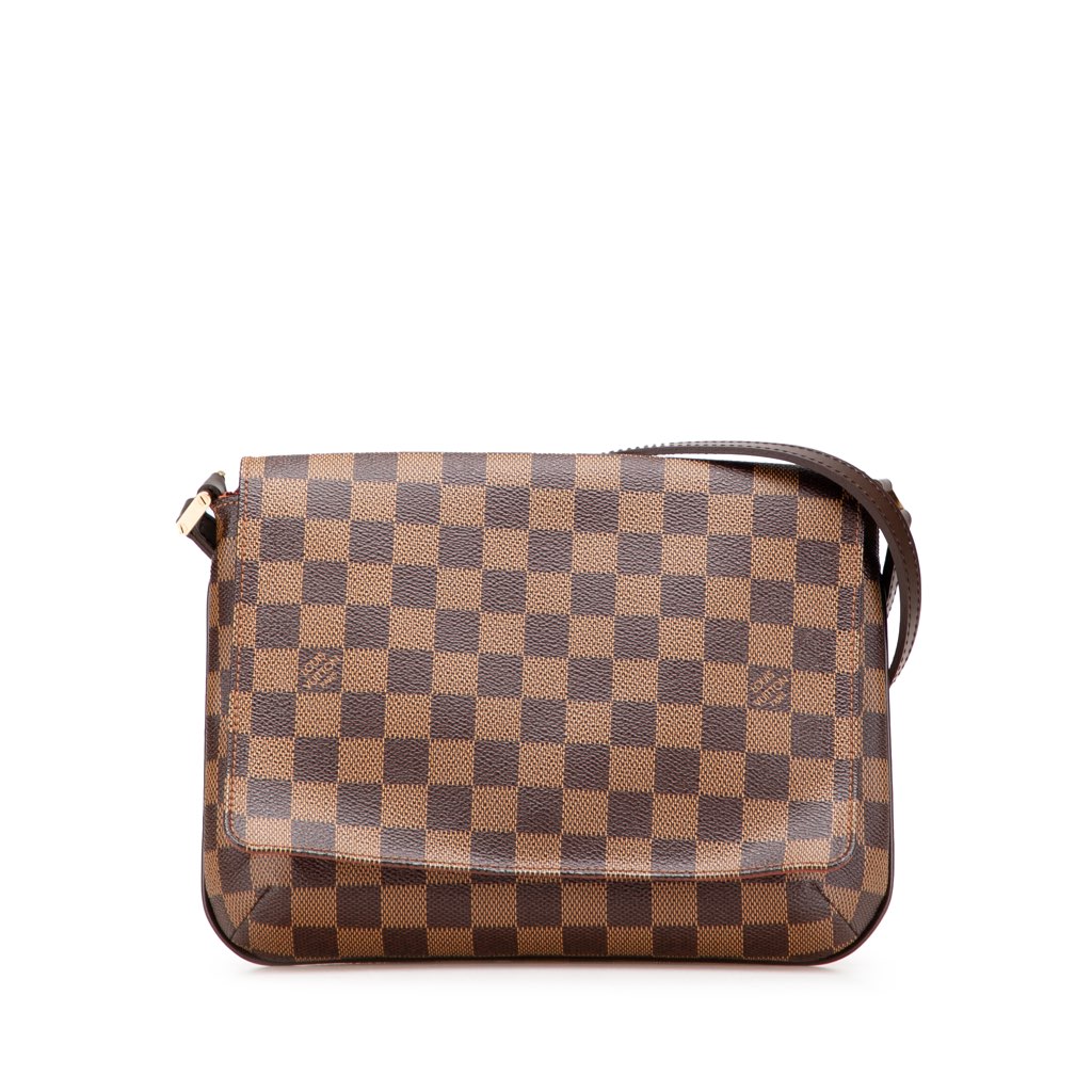 The Musette Tango features a damier ebene canvas body, a flat leather shoulder strap, a front flap with a magnetic closure, and an interior slip pocket.